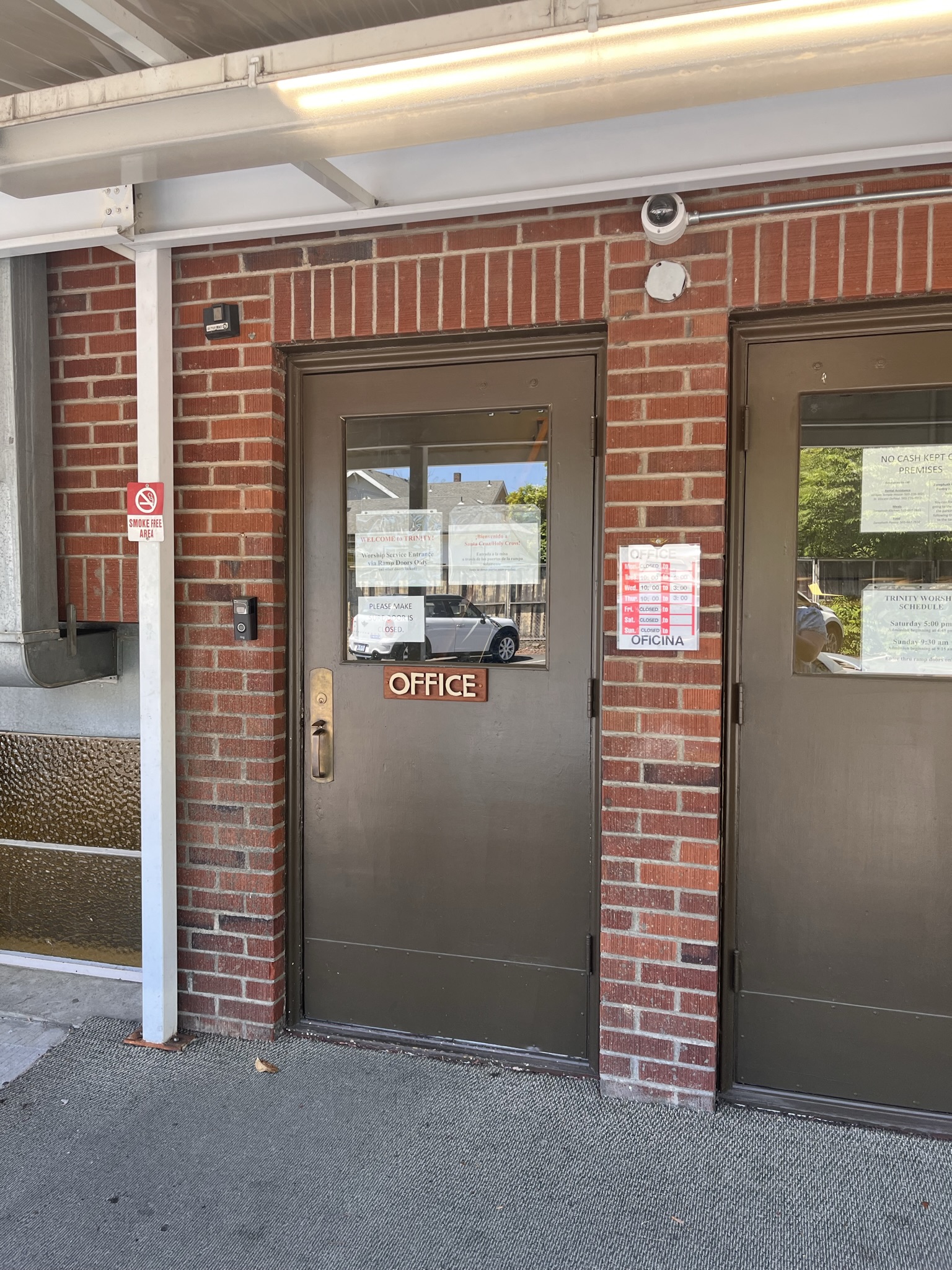 If you come during the week, you will need to enter through the door pictured below. Press the Ring button there on the left side of the door, wait a moment, and then pull the door because the person in the office might be trying to let you in. You may hear a slight click when the door unlocks, otherwise, there is no notification that the doors are now unlocked. Close the door behind you and the door will automatically relock.